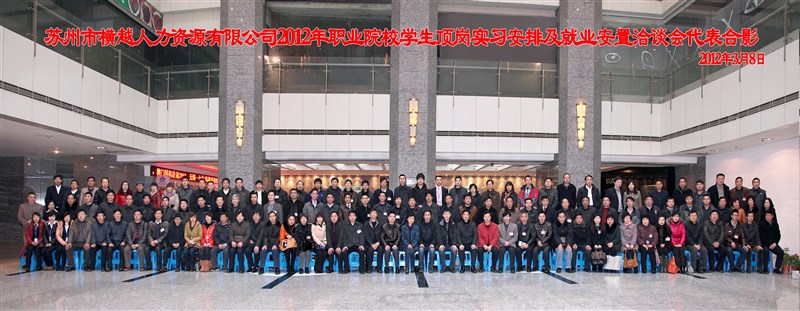2012年3月7日-10日:蘇州市橫越人力資源有限公司2012年職業(yè)院校學(xué)生頂崗實(shí)習(xí)安排及就業(yè)安置洽談會(huì)在蘇州水洲飯店舉行。80余家職業(yè)院校及30家企業(yè)共260余名代表與會(huì)。蘇州市、各區(qū)勞動(dòng)局、蘇州工業(yè)園區(qū)人力資源中心部分領(lǐng)導(dǎo)到會(huì)交流、指導(dǎo)。與會(huì)代表與我公司全體員工共同度過了緊張熱烈、友好愉快的7天時(shí)光。60余家職業(yè)院校和企業(yè)領(lǐng)導(dǎo)來函、來電祝賀。